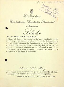 Carta del president de la Diputació de Tarragona al president del Centre de Lectura