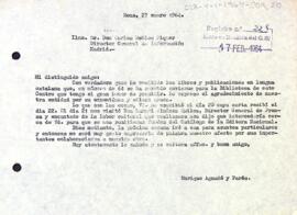 Enric Aguadé agraeix a Carlos Robles l'enviament de diversos llibres en català per a la biblioteca del Centre de Lectura. Data del document: 27-01-1964