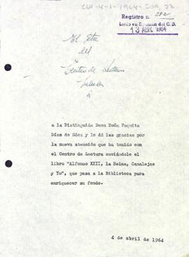 Enric Aguadé agraeix a Paquita Díaz l'enviament de l'obra "Alfonso XIII, la Reina, Canalejas y Yo". Data del document: 04-04-1964