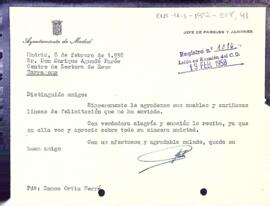 Ramon Ortiz envia una carta en agraïment de les paraules del president Aguadé. Data del document: 08-02-1958