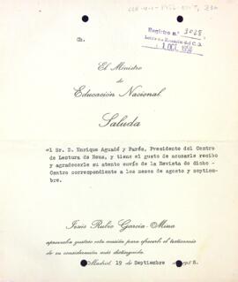 El ministre d'Educació Nacional, Jesús Rubio, agraeix l'enviament del darrer número de la Revista del Centre de Centre de Lectura. Inclou el programa. Data del document: 19-09-1958