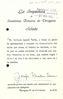 Josefina Mateu agraeix al president Aguadé que el Centre de Lectura cedeixi una de les seves sales per fer-hi la reunió de mestres de la zona. Data del document: 20-11-1958