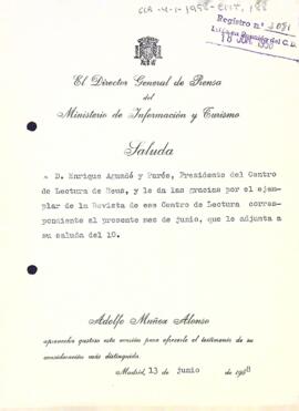 El director general de premsa, Adolfo Muñoz, agraeix l'enviament del darrer número de la Revista del Centre de Lectura. Data del document: 13-06-1958