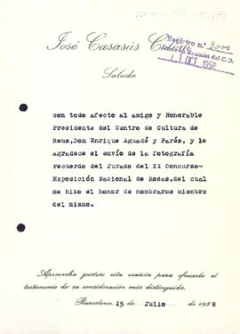 Josep Casasús agraeix a Aguadé l'enviament de la fotografia en record de la seva participació com a jurat durant el XI Concurs Exposició Nacional de Roses. Data del document: 15-07-1958