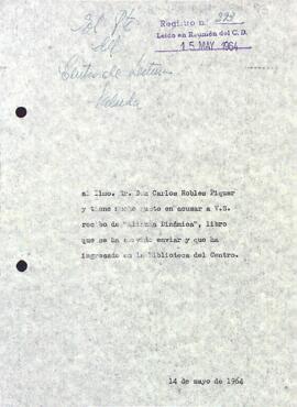 Enric Aguadé agraeix a Carlos Robles l'enviament de l'obra "Alianza Dinámica". Data del document: 14-05-1964