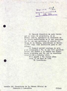 Enric Aguadé envia un agraïment en nom del Consell Directiu a la Cámara Oficial de Comercio é Industria per la concessió d'una subvenció de 15000 pessetes. Data del document: 27-05-1964