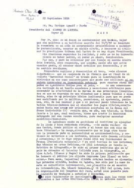 Antonio Olías explica al president Aguadé que no podrà desplaçar-se al Centre de Lectura, però agraeix l'enviament d'un exemplar de la Revista del Centre de Lectura on apareix una carta seva i elogia Reus i els seus habitants. Data del document: 19-09-1958