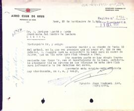 L'Aero Club de Reus accepta al soci del Centre de Lectura Joaquim Durà com a beneficiari de la beca que ofereixen per al curs de pilot. Data del document: 23-09-1958