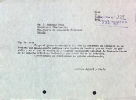 Enric Aguadé Parés envia a Antonio Tena, secretari tècnic del Ministerio de Educación Nacional, un exemplar de la Revista del Centre de Lectura on es parla del X Concurs Exposició Nacional de Roses. Data del document: 21-06-1957