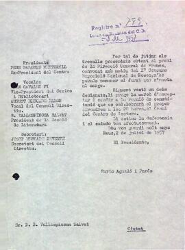 Enric Aguadé Parés ha nomenat a Bonaventura Vallespinosa Salvat, jurat del premi de la Direcció General de Premsa, amb motiu del X Concurs Exposició Nacional de Roses, i el convoca a la reunió de constitució. Data del document: 02-07-1957