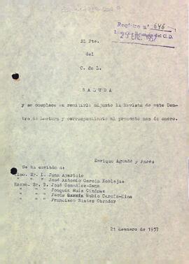 Còpia de la carta del Centre de Lectura a diverses personalitats, adjuntant un exemplar de la Revista del Centre de Lectura de gener de 1957. Es va enviar a: Juan Aparicio, José Antonio García-Noblejas, José González-Sama, Joaquín Ruiz Giménez, Jesús Rubio García-Mina, Francisco Sintes Obrador. Data del document: 21-01-1957