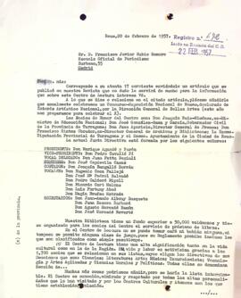 Enric Aguadé Parés envia a Francisco Javier Rubio Romero, de l'Escuela Oficial de Periodismo, la informació sol·licitada sobre el Centre de Lectura. Data del document: 20-02-1957