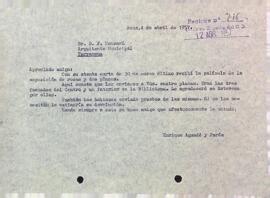 Enric Aguadé Parés informa a J. Monravà, arquitecte municipal de Tarragona, que han rebut la pel·lícula de l'exposició de roses i 2 plaques, però que falta encara més material per retornar. Data del document: 04-04-1957