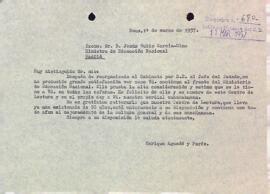 Enric Aguadé Parés felicita a Jesús Rubio García-Mina per la seva reelecció en el càrrec de Ministre d'Educació Nacional. Data del document: 01-03-1957