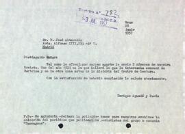 Enric Aguadé Parés envia a José Altabella, de la Escuela Oficial de Periodismo de Madrid, 2 números de la Revista del Centre de Lectura, que parlen sobre l'entitat i el Teatre Bartrina. Data del document: 28-06-1957