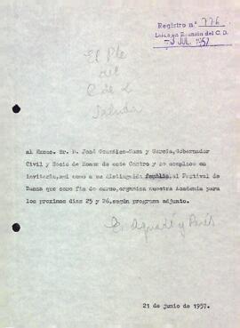 Enric Aguadé Parés convida a José González-Sama y García al Festival de Dansa del Centre de Lectura de Reus. Data del document: 21-06-1957