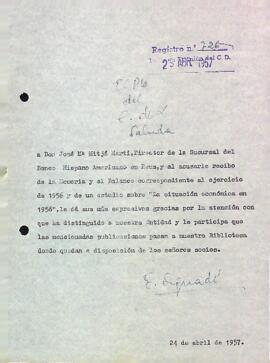 Enric Aguadé Parés agraeix a Josep M. Mitjà Martí, director del Banco Hispano Americano, de l'obsequi de 2 llibres per a la biblioteca. Data del document: 24-04-1957