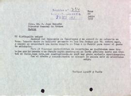 Enric Aguadé Parés informa a Juan Beneyto que s'han rebut 11 treballs per al Concurs periodístic de reportatges. Data del document: 20-07-1957