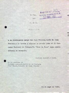 Enric Aguadé Parés demana a Juan Freixas un premi per al II Concurso Nacional de Fotografía Rosa de Reus. Aquesta mateixa carta es va enviar a Mariano Mercadé i José Ripoll. Data del document: 23-05-1957