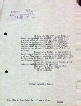 Enric Aguadé Parés agraeix a la vídua de Jaume Prats i als seus fills el donatiu dels clixés de les publicacions reusenques editades per ell. Data del document: 05-06-1957