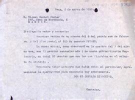 El comptable de l'entitat respon a Miquel Cachot explicant el perquè de la quantitat de 20 pessetes, corresponents al volant d'admissió com a soci de l'entitat.