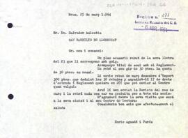 Enric Aguadé saluda al nou soci Salvador Aulestia i li fa arribar les factures de la quota, així com el darrer número de la Revista del Centre de Lectura. Data del document: 25-03-1964