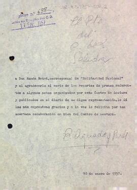 El president del Centre de Lectura agraeix a Ramon Botet, correponsal de "Solidaridad Nacional", l'enviament de retalls de premsa sobre l'entitat. Data del document: 10-01-1957