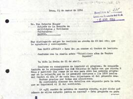 Enric Aguadé respon a les preguntes enviades per Roberto Bieger, tant pel que fa al títol de l'acte com a les obres teatrals que representarà. Data del document: 23-03-1964