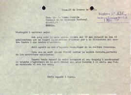 Enric Aguadé Parés agraeix a Roman Perpiñà, del Consell de la Economia Nacional, l'obsequi de 19 publicacions per a la Biblioteca del Centre de Lectura. Data del document: 25-02-1957