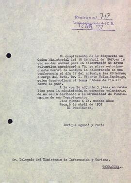 El Centre de Lectura demana autorització al Ministeri d'Informació i Turisme per a una conferència de Vicente Nolla, "Ideas de Pío XII sobre la paz". Data del document: 06-04-1957