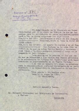 El Centre de Lectura demana autorització al Ministeri d'Informació i Turisme per a la celebració de dos actes el dia 23 de gener de 1957. Data del document: 14-01-1957