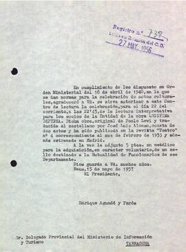 Enric Aguadé Parés demana autorització al delegat provincial del Ministeri d'Informació i Turisme per a la celebració el dia 22 de maig d'una lectura en veu alta de l'obra "Legítima defensa", de Paolo Levi. Data del document: 15-05-1957