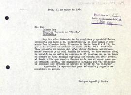 Enric Aguadé envia una carta de suport a la proposta de batejar amb el nom de Fortuny un dels avions de la companyia Iberia. Inclou el document que certifica aquesta elecció. Data del document: 21-03-1964