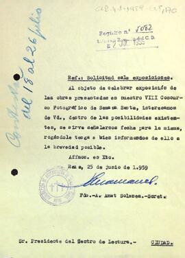 Artur Amat sol·licita a Enric Aguadé el permís per a poder celebrar a la sala d'exposicions el VIII Concurs Fotogràfic de Setmana Santa.