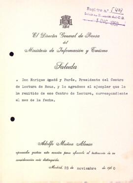 Adolfo Muñoz Alonso, Director General de Premsa del Ministeri d'Informació i Turisme, agraeix a Enric Aguadé Parés l'obsequi d'un exemplar de la Revista del Centre de Lectura de Reus. Data del document: 28-11-1960