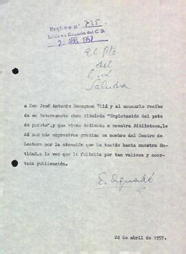 Enric Aguadé Parés agraeix a José Antonio Romnagosa Vilà el donatiu d'un exemplar de la seva obra "Explotación del pato de puesta". Data del document: 24-04-1957
