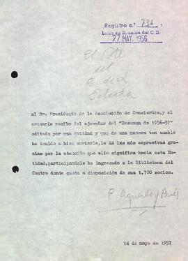 Enric Aguadé Parés agraeix al president de l'Associació de Concerts el donatiu d'un exemplar del "Resumen de 1956-57". Data del document: 14-05-1957