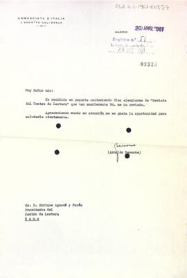 Carta d'agraïment de l'ambaixador d'Itàlia al president del Centre de Lectura