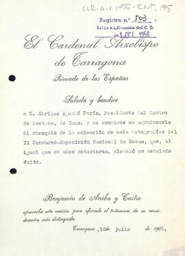 Carta d'agraïment del Cardenal Arquebisbe de Tarragona al president del Centre de Lectura