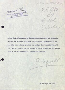 Carta d'agraïment del president a Pere Benavent pel donatiu d'un llibre