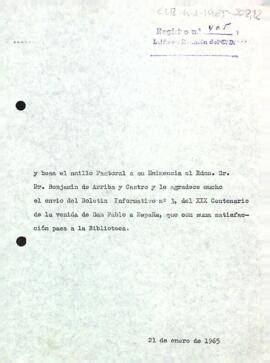 Carta d'agraïment del president del Centre de Lectura al Cardenal Benjamin de Arriba y Castro