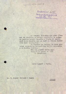 El Consell Directiu expressa el seu condol a August Mercadé i Ramon per la mort de la seva mare. Data del document: 18-01-1957