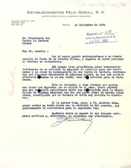 Carta d'Establecimientos Félix Gasull al president del Centre de Lectura