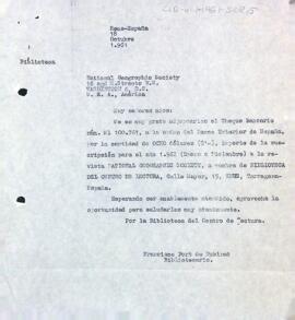 Francesc Font de Rubinat, el bibliotecari, informa de l'adjunció del xec bancari corresponent a la subscripció anual de la revista National Geographic.