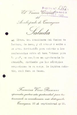 Francesc Vives Recasens, Vicari General del Arquebisbat de Tarragona excusa la seva assistència a les conferències sobre "Átomos para la paz". Data del document: 26-09-1960