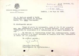 Francisco Gozálvez, de la Sección Actos Culturales de la Dirección General de Información, proposa al Centre de Lectura una conferència a càrrec de Vicente Marrero, de qui adjunta curriculum vitae. Data del document: 03-05-1960