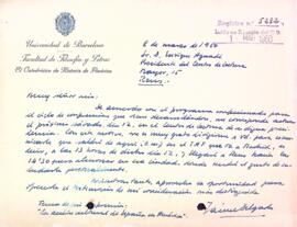 Jaime Delgado, informa al president del Centre de Lectura de l'hora d'arribada a Reus, per tal de celebrar la conferència "La acción cultural de España en América", el dia 12 de març de 1960. Data del document: 08-03-1960