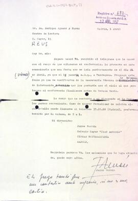 Jaume Ferran proposa un nou dia per la conferència que va aplaçar. Data del document: 01-04-1957