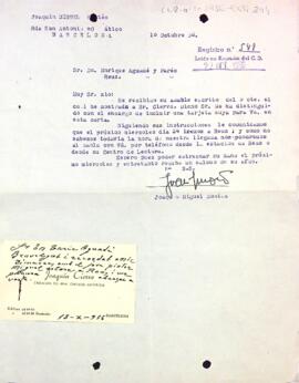 Joaquin Miguel comunica a Enric Aguadé la seva pròxima visita a Reus junt amb Joquin Ciervo.