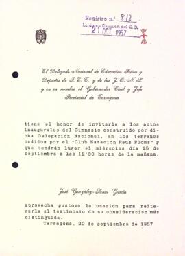 José González-Sama García, governador civil de Tarragona, convida al Centre de Lectura a la inauguració del gimnàs construït en els terrenys cedits pel Club Natació Reus Ploms. Data del document: 20-09-1957